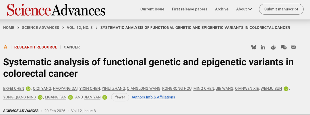 2026年2月20日,西北大学生命科学与医学部严健教授团队在Science Advances上发表了题为“Systematic analysis of functional genetic and epigenetic variants in colorectal cancer”的研究论文。该研究构建了一套整合性功能基因组学流程,首次在原发性与转移性结直肠癌细胞中,系统揭示了非编码SNP与CpG甲基化对增强子活性的调控网络,为理解结直肠癌的发病与转移机制提供了全新视角。