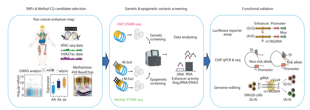 研究团队整合了SNP-STARR-seq与Methyl-STARR-seq两大高通量筛选平台,在三种结直肠癌细胞模型(原发性HCT116、SW480及转移性SW620)中,系统评估了30,790个非编码SNP与超过134,000个CpG位点对增强子活性的影响。通过这一规模化筛选,团队绘制了CRC迄今最全面的等位基因与甲基化依赖性增强子活性图谱,建立了从变异识别到机制验证的完整研究范式。