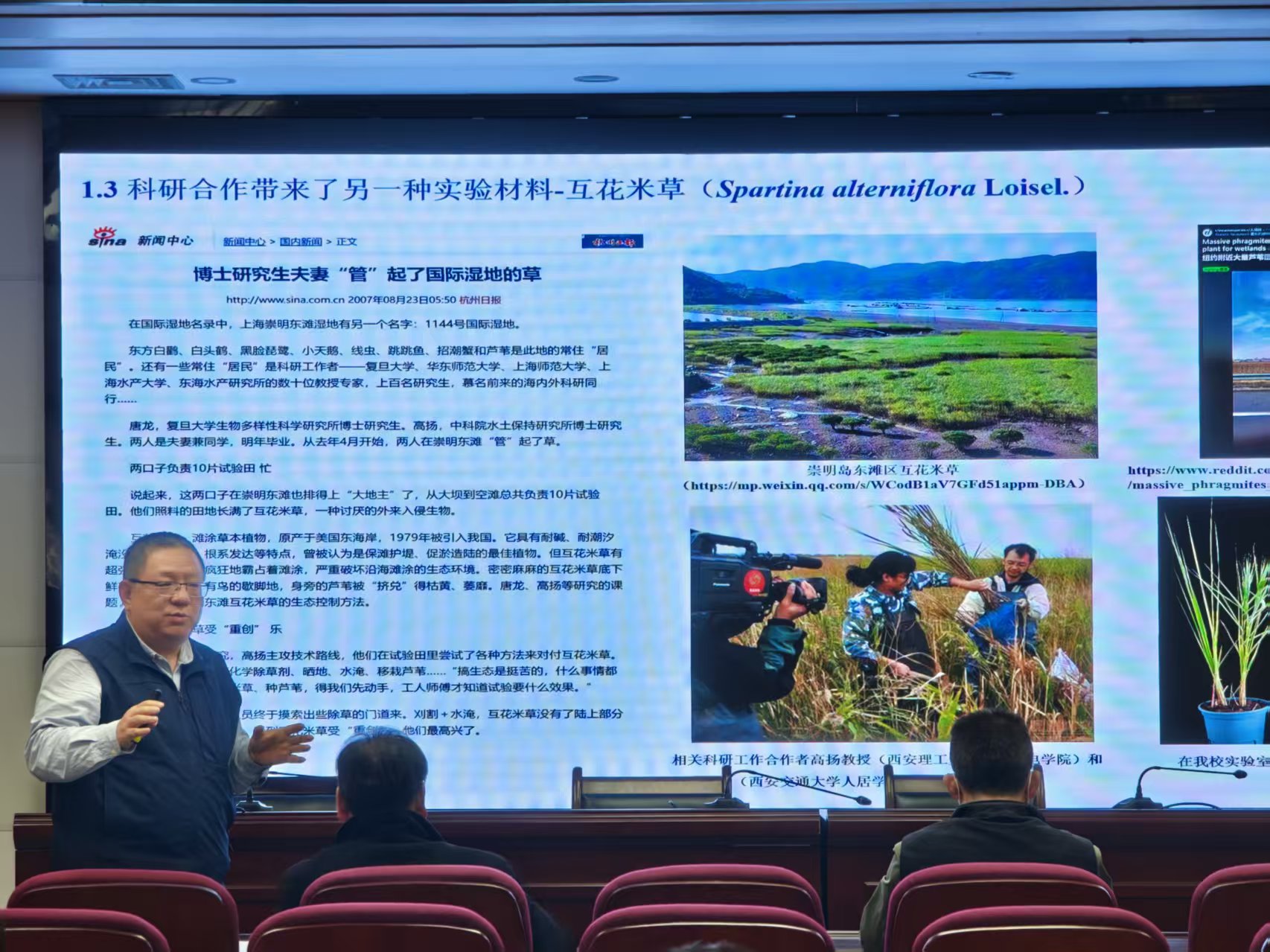 随后,赵宇玮老师系统介绍了团队多年来在相关领域的研究进展:从早期开展小麦细胞工程研究,到围绕青稞抗逆机制的连续探索,课题组发现外源褪黑素在低温条件下能够调节青稞生物钟节律,从而影响氧化还原稳态并提升抗逆能力;在互花米草研究方面,课题组结合转录组测序与实验室竞争体系构建,尝试挖掘复合胁迫响应的关键功能基因,初步揭示了部分关键基因在植物耐盐性与生物竞争适应过程中的潜在调控作用。同时,针对互花米草等非模式植物基因功能验证体系相对欠缺、竞争体系构建复杂等研究挑战,课题组分享了利用模式植物替代验证、结合高通量组学数据进行候选基因筛选与功能推断等方法的探索实践。此外,赵宇玮老师还介绍了课题组未来的研究规划。借助学院近期新增的关键实验设备,课题组将进一步聚焦生物钟与光合作用系统之间的功能关联,力图构建更为完整的禾本科植物复合抗逆调控网络,为作物抗逆改良和生态适应性提升提供理论基础与技术储备。