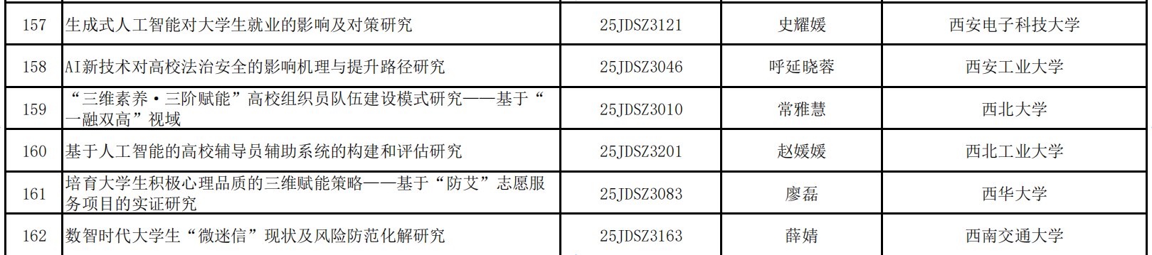 近日,教育部社会科学司公布了2025年度教育部人文社会科学研究一般项目立项名单,我院辅导员常雅慧主持的《“三维素养・三阶赋能”高校组织员队伍建设模式研究——基于“一融双高”视域》获批高校辅导员研究专项。