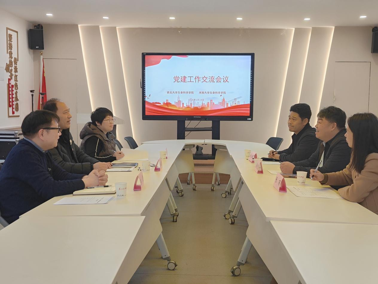 1月19日下午,西北大学生命科学学院党委与河南大学生命科学学院党委,在西北大学太白校区开展党建工作交流会,围绕“深化‘一融双高’,以高质量党建引领高质量发展”主题展开深入交流。河南大学生命科学学院党委书记梁建忠、党委副书记宋永鹏、党委办公室主任张丽,西北大学生命科学学院党委书记刘小光、副书记陈露、党委组织员常雅慧参加交流。会议由西北大学生命科学学院党委书记刘小光主持。