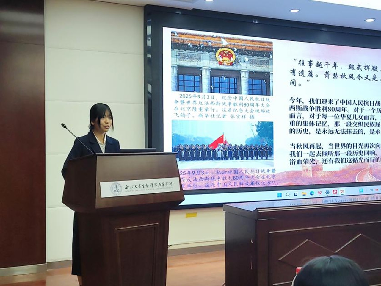 随后,西北大学生命科学学院学生代表黄萌同学以“山河无恙,警钟长鸣——纪念世界反法西斯胜利80周年暨9·3阅兵精神传承”为主题作汇报,通过历史回顾与精神解读,进一步深化了同学们的历史认知与时代责任意识。