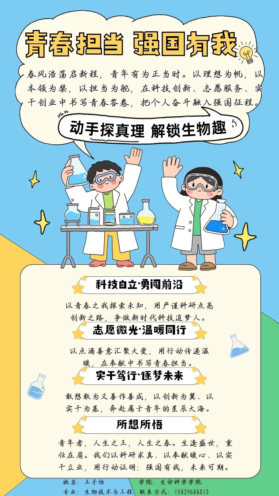 春光正好,征程已启。站在“十五五”的新起点上,我愿以青春之我、奋斗之我,为实现高水平科技自立自强贡献生科力量!让生命科学的创新之光,照亮中国式现代化的壮阔征途!