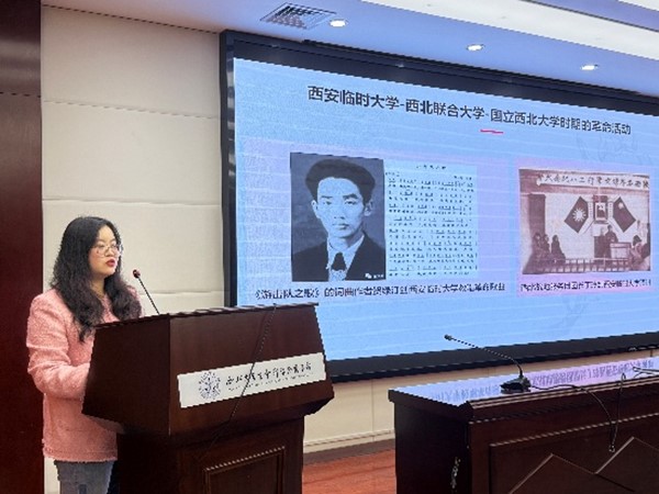 10月20日上午,学院邀请校档案馆赵嘉文老师作《西北大学校史中的红色记忆》专题讲座,赵老师以时间轴为主线,从早期党组织建立、西北联大烽火办学,到建国后学科崛起、新时代争创一流,用珍贵照片与档案呈现百廿年西大与民族共奋进的壮阔画卷,深刻诠释“公诚勤朴”校训和“艰苦创业、自强不息”的精神传统。她勉励大家赓续红色血脉,把个人理想融入国家需求,在科研探索与社会实践中勇当先锋。