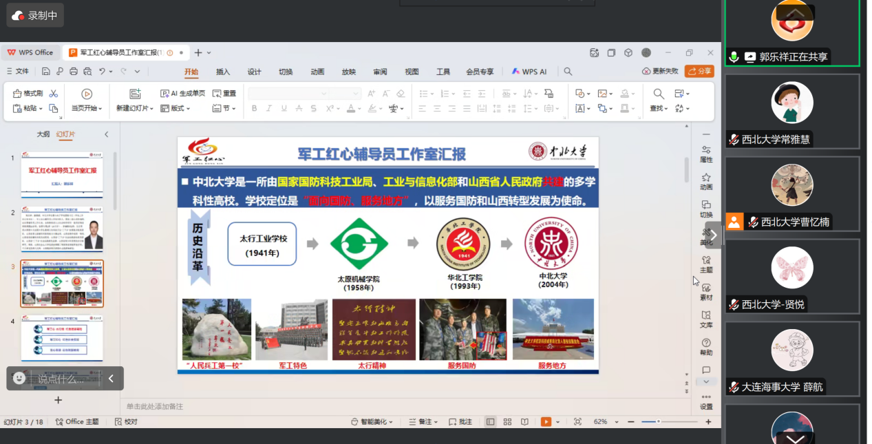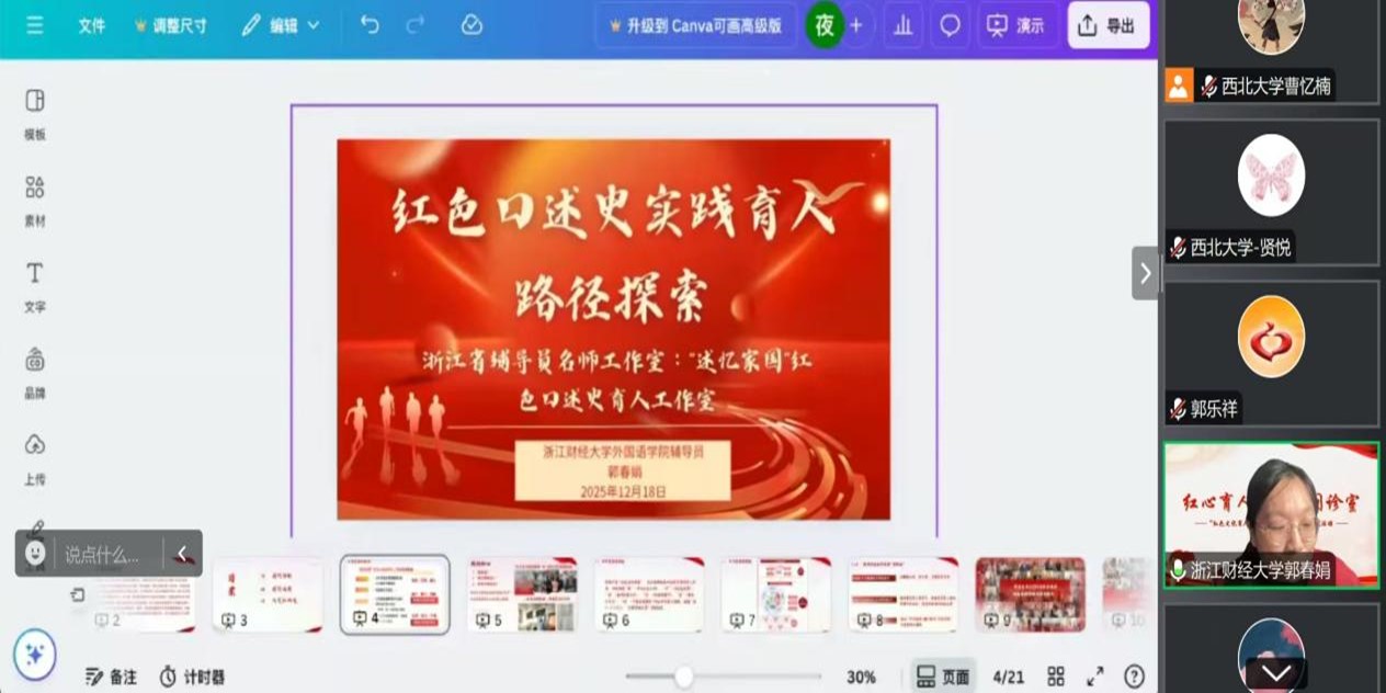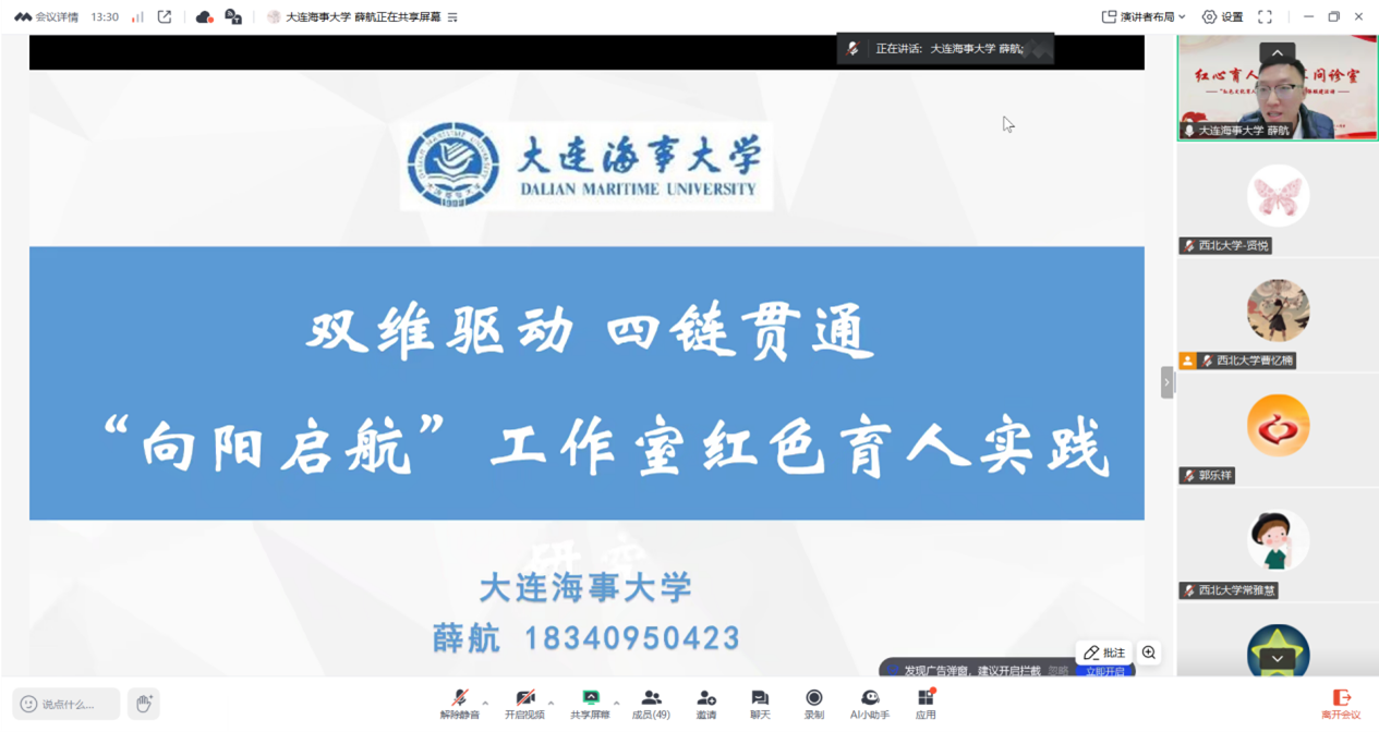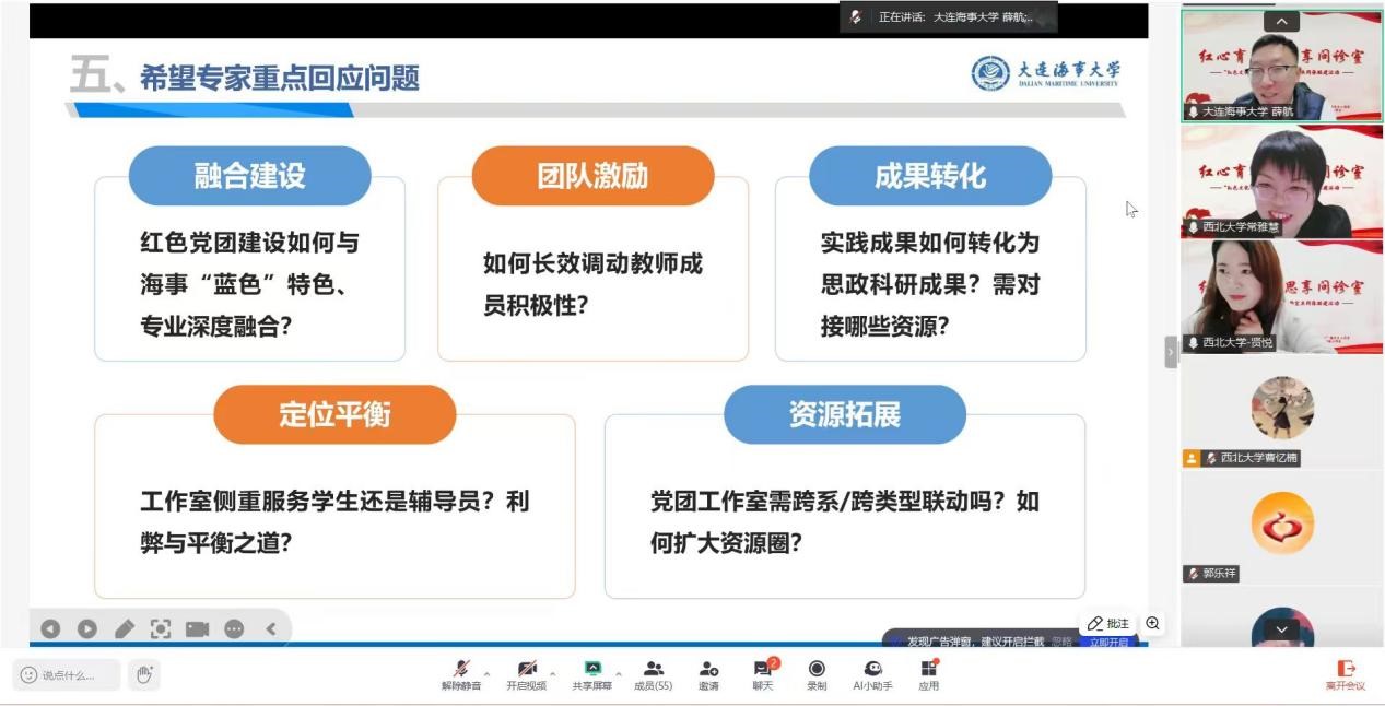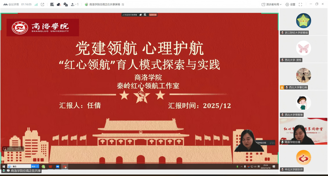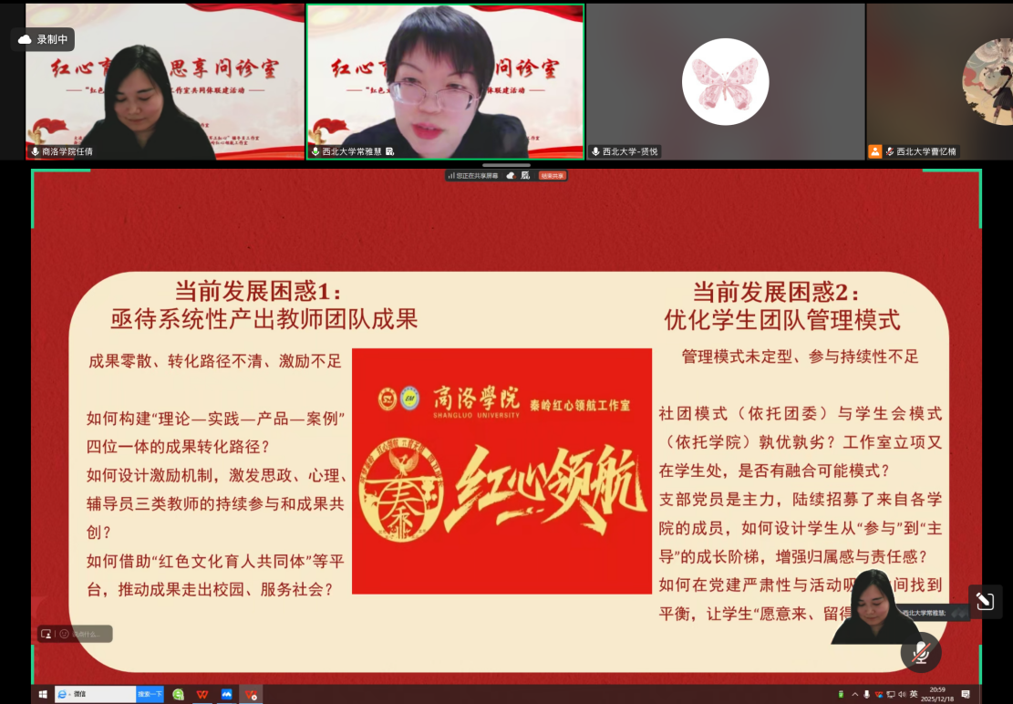 2025年12月18日,首期“红心育人·思享问诊室”——“红色文化育人”辅导员工作室共同体联建活动以线上形式顺利开展。本次活动由西北大学“红色基因”辅导员工作室承办,大连海事大学、中北大学、浙江财经大学、商洛学院四所高校辅导员工作室联合协办,旨在搭建跨地域、跨校际交流平台,共同探索红色文化育人新路径、新方法。活动邀请首批教育部辅导员名师工作室主持人、全国高校辅导员年度人物、西北大学生命科学学院辅导员常雅慧副教授担任点评专家,由陕西省辅导员素质能力提升训练营“业务标兵”、西北大学计算机学院辅导员贤悦主持,“红色文化育人”辅导员工作室共同体成员单位五十余名师生齐聚云端参与交流。