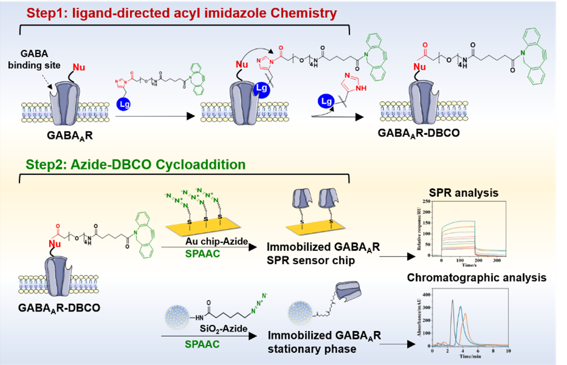 药靶蛋白高活性固定化方法的建立是构建生物传感器、亲和色谱等分析方法检测灵敏度、选择性和准确性的关键。然而,现有药靶蛋白固定化技术主要依赖于纯化或重组蛋白,缺乏直接从活细胞中捕获低丰度内源天然药靶蛋白的有效策略。针对这一问题,赵雪/赵新锋在前期研究基础上(Anal. Chem. 2025, 97(18):10046-10055),聚焦GABAA受体,以其经典配体Afloqualone为亲和识别模块,通过二者的特异性识别与结合,将酰基咪唑基活化的配体衍生物(AfloAI)导向至GABAA受体配体结合域附近,借助AfloAI亲电基团与结合域附近亲核氨基酸残基的酰基取代反应及AfloAI自身炔烃基团与固体界面叠氮基团间的环辛炔-叠氮环加成反应,实现了细胞内天然态GABAA受体的快速、高活性固定。