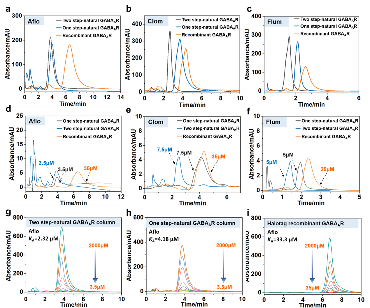 用上述方法制备了固定化天然态GABAA受体的SPR传感芯片和色谱固定相。由于固定化蛋白质活性高、稳定性好,在分析药物-受体的相互作用时,其检测灵敏度比固定化重组受体芯片提高了~3.5倍,测定的亲和力(KD值)提升了~10倍。色谱分析结果显示,与重组受体相比,天然GABAA对配体的选择性、分离度和检测灵敏度分别提升了~10倍、~3.2倍和~10倍。