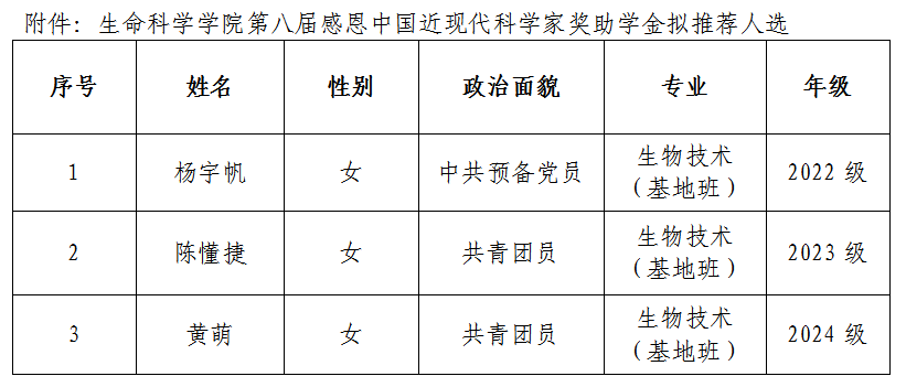 生命科学学院第八届感恩中国近现代科学家奖助学金评选工作拟推荐人选公示