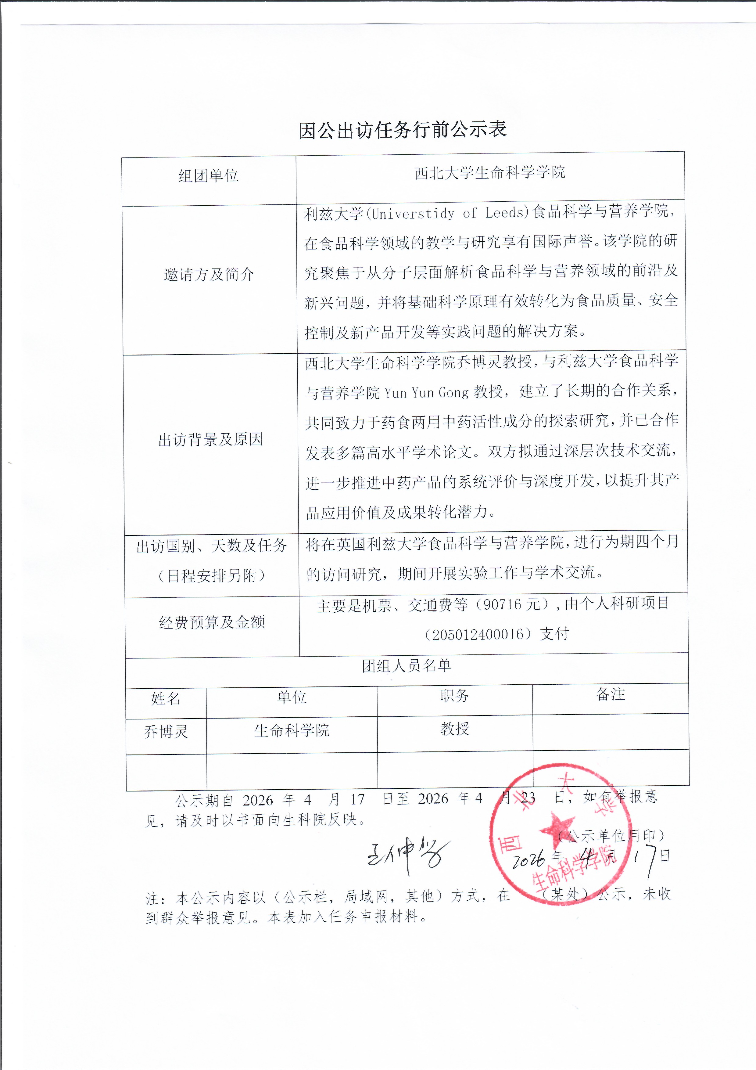 因公出访任务行前公示表