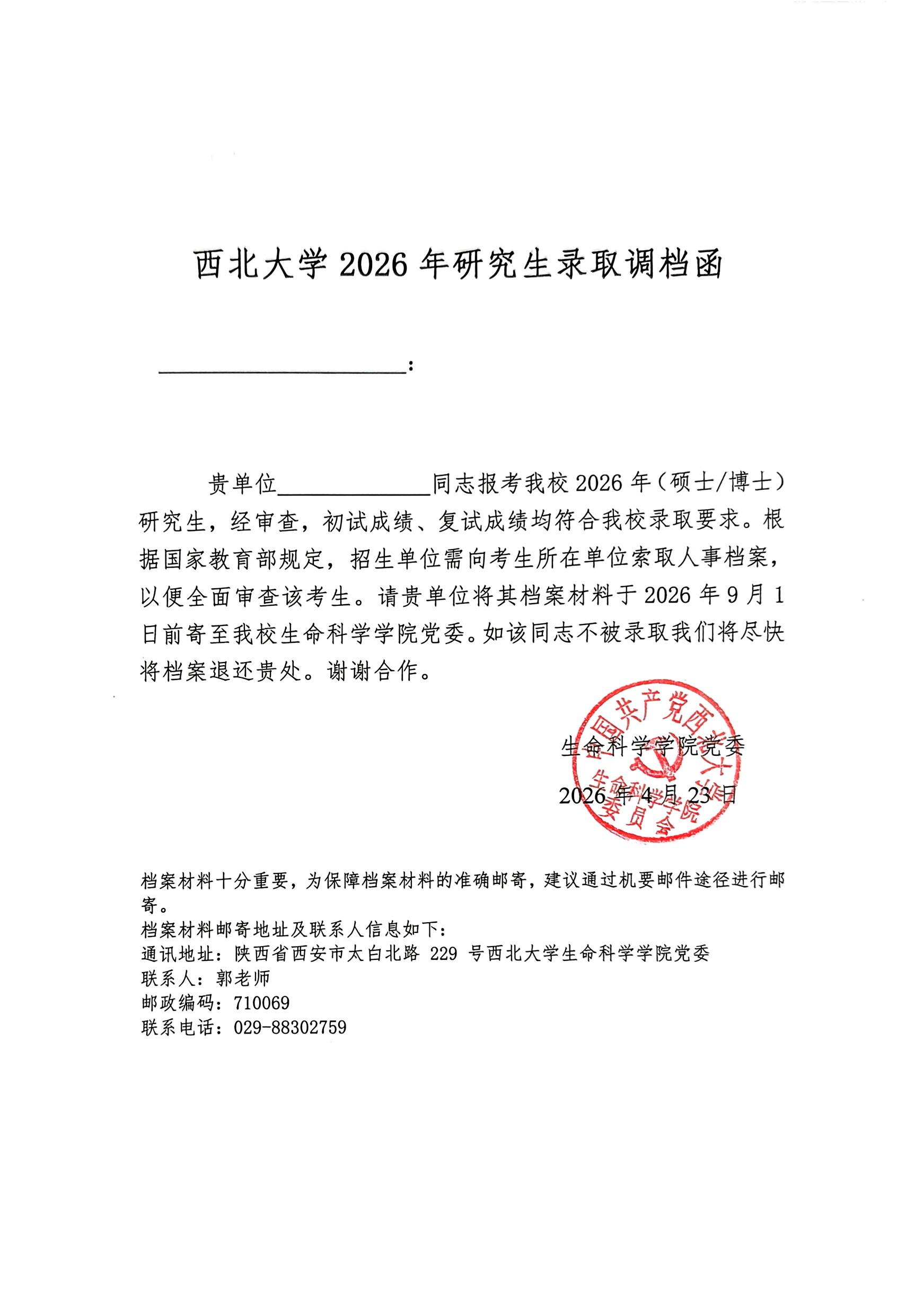 西北大学2026年研究生录取调档函