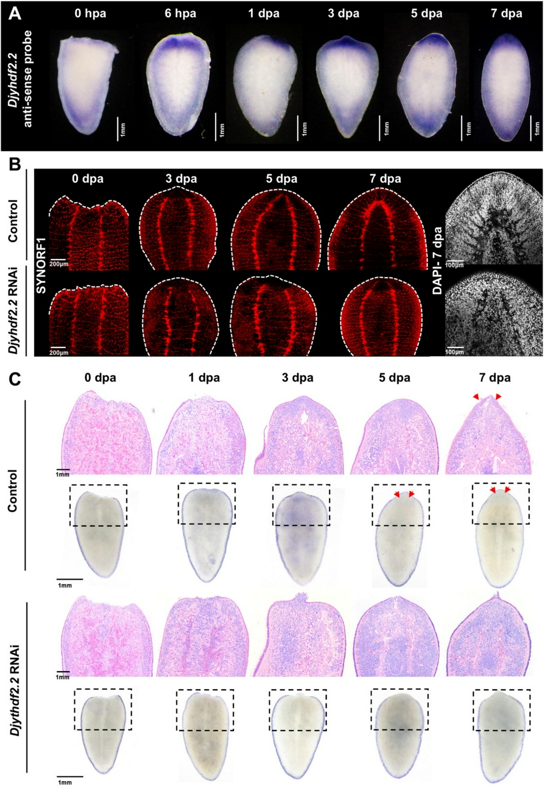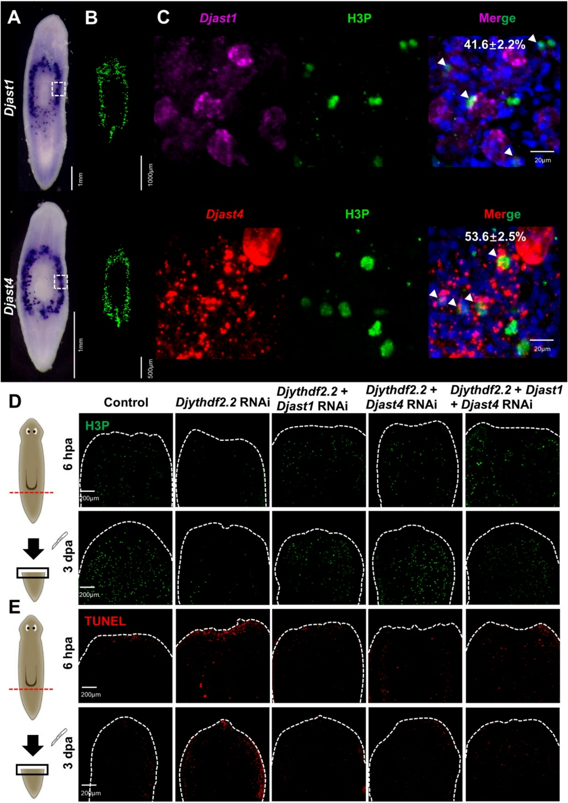 研究发现,涡虫被截断后,ythdf2.2表达显著上调;敲低该基因会导致再生芽基形成缺陷、眼点再生失败,并破坏组织稳态。通过整合MeRIP-seq与RNA-seq技术,研究团队鉴定出金属内肽酶基因astacin是YTHDF2.2的关键m6A修饰靶标。YTHDF2.2能够识别astacin mRNA上的m6A修饰并促进其降解。当YTHDF2.2被敲低后,astacin mRNA稳定性异常升高、大量积累,进而抑制干细胞增殖、增加细胞凋亡,最终导致再生障碍。而同时敲低ythdf2.2与astacin,则可显著恢复干细胞增殖能力与涡虫的再生表型。