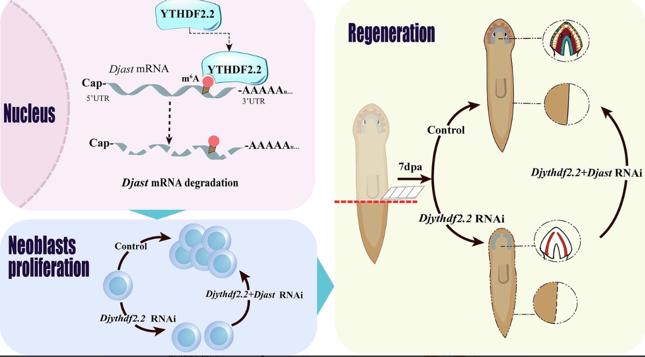 近日,西北大学陈富林、余源课题组在Journal of Advanced Research上在线发表了题为RNA m6A-binding protein YTHDF2 regulates neoblast proliferation in planarian regeneration by targeting ASTACIN Signaling的研究论文。该研究聚焦于m6A结合蛋白YTHDF2在涡虫再生中的功能,系统揭示了其通过降解特定靶基因维持干细胞池的新机制,为理解组织再生和干细胞调控提供了新视角。